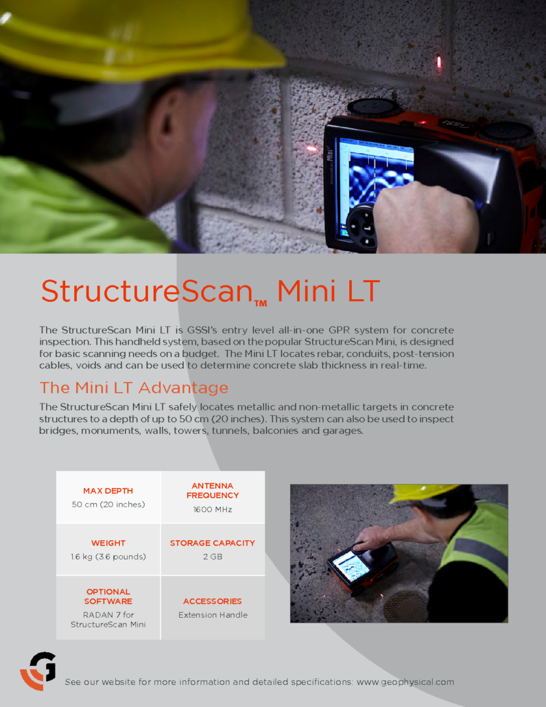 Concrete Scanning Made EasyThe StructureScan Mini LT is compact and lightweight – weighing only 1.6 kg (3.6 lbs.), making it easy to use on the ground or for above-the-head survey locations.